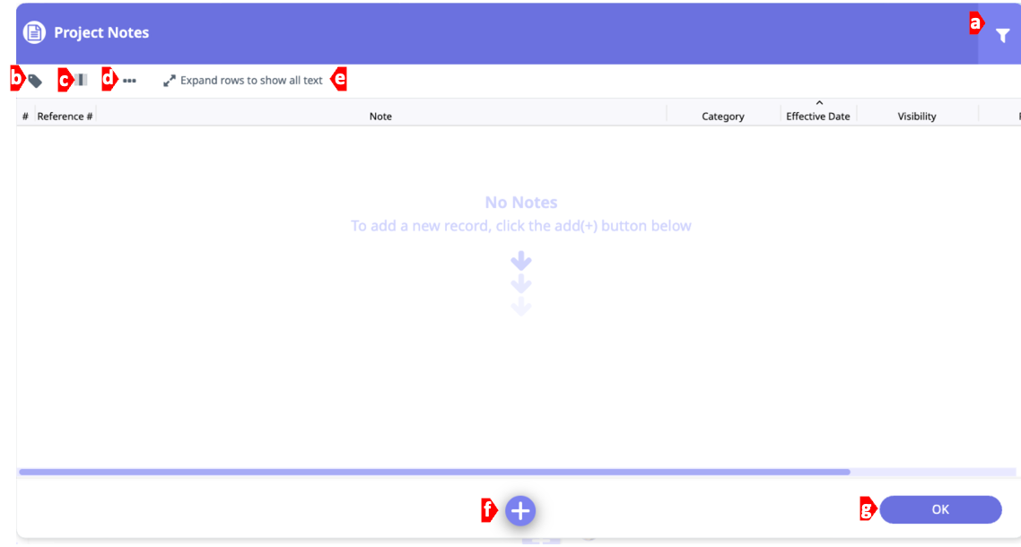 b. Group: Arrange notes by project or category. c. Column Display Settings: Choose which columns should appear in the Project Notes display. d. More Options: Choose to Reset Columns (moving them back to their original placement and width), to Export project notes as an XLS file, or to Print to PDF. e. Expand Rows: Click to display all text in notes, regardless of length. f. Add a Note: Click to add a new note. Learn more about this here. g. OK: Click to close the Project Notes dialogue.