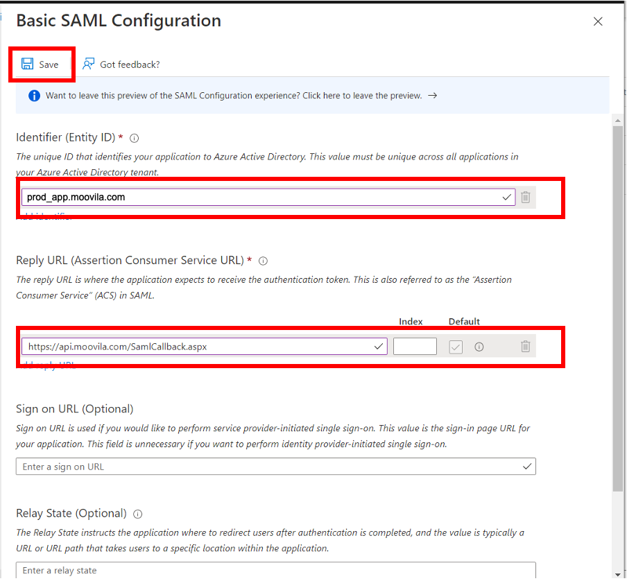 Enter https://api.moovila.com/samlcallback.aspx as the Replay URL (Assertion Consumer Service URL).