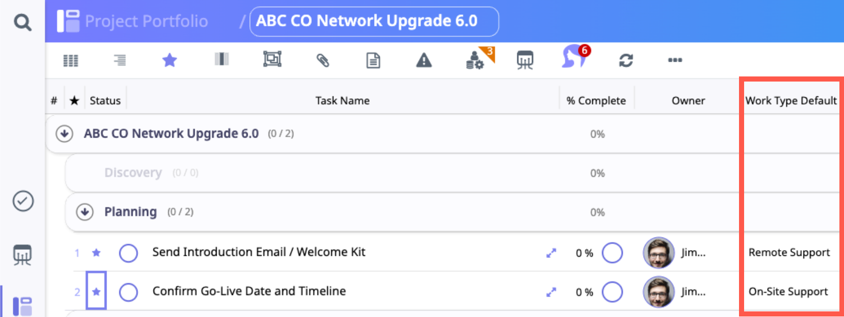- The Default Work Type column now displays in the Power Grid. Click into this column for a task to apply or modify a default work type.