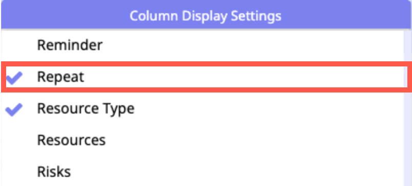 - Go to the project in which you'd to apply the repeat task. Click into the Column Display icon in the upper navigation, and select the Repeat column from the dropdown menu.