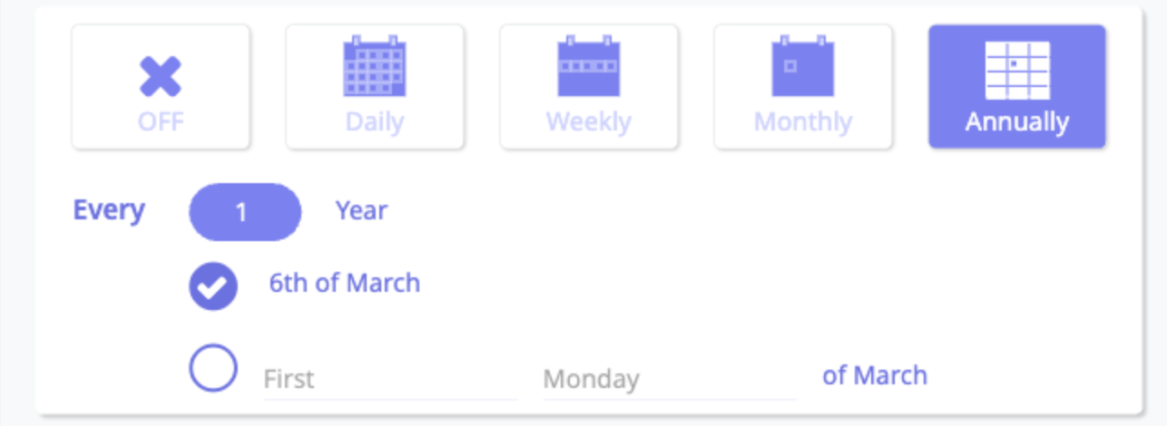 e. Annually: This task will be repeated annually with the frequency indicated--every one year will create a task for every year, every two years will create a task for every other year, etc. Choose to repeat annually using the date on which the first task will occur or by selecting a specific day in the year (e.g. the 3rd Wednesday of the month in which the first task will occur).