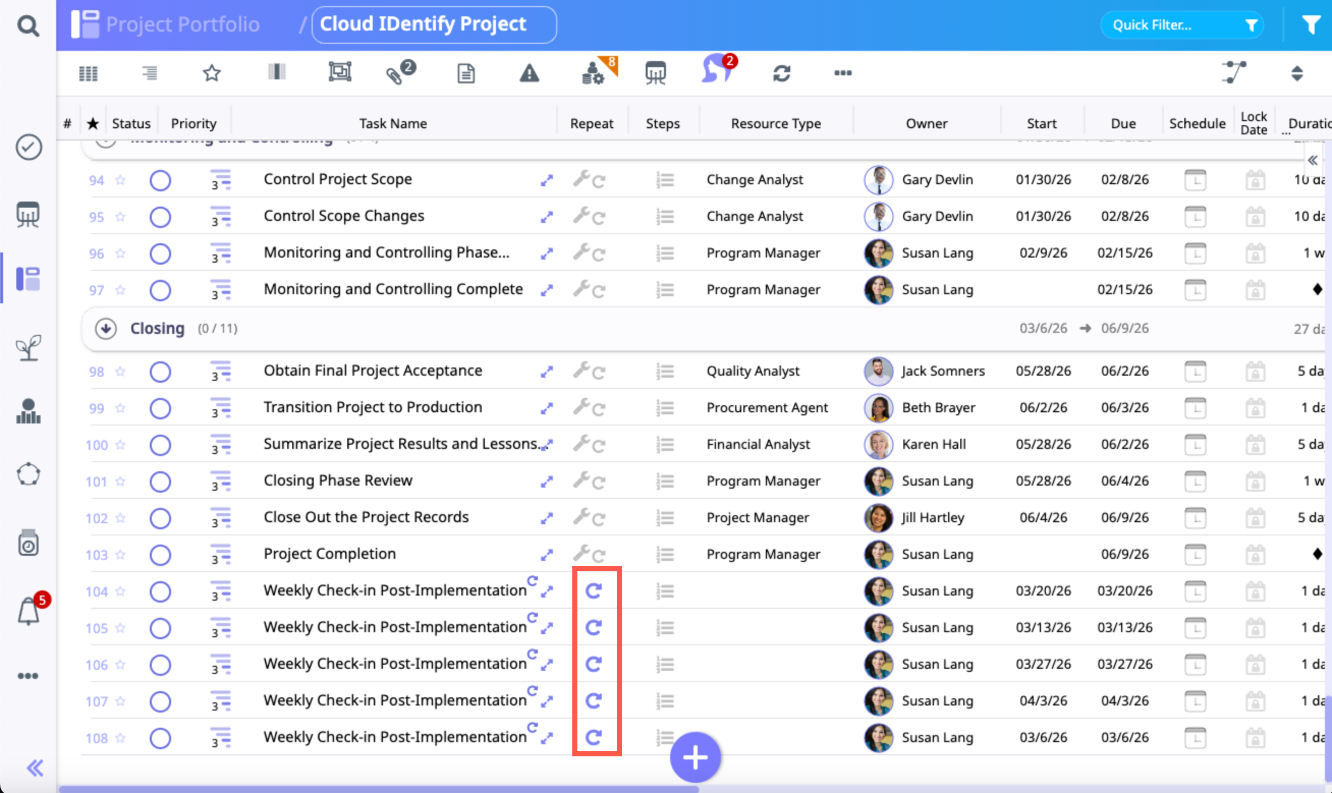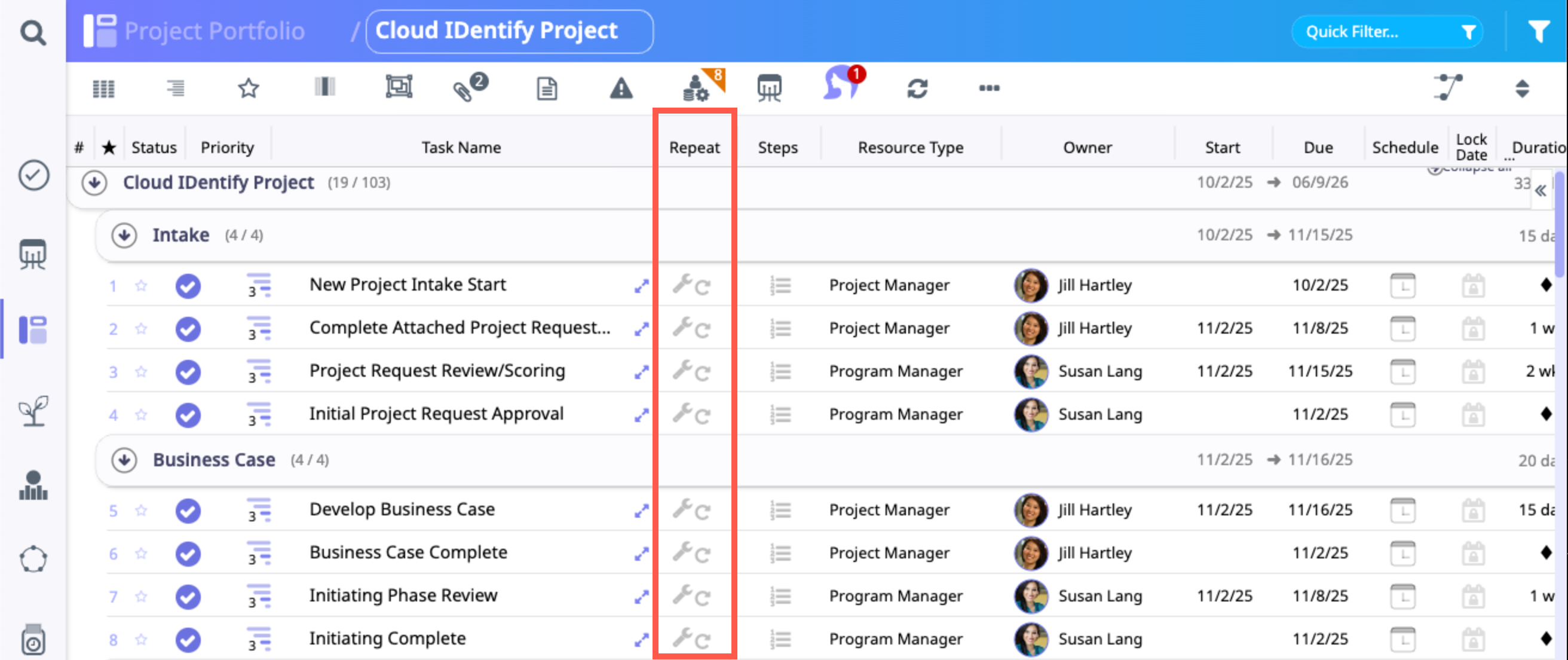- Note that all of these new repeat tasks contain the Repeat icon both in the task name and in the Repeat column. To edit the series of repeating tasks, click on the Repeat icon in the Repeat column.