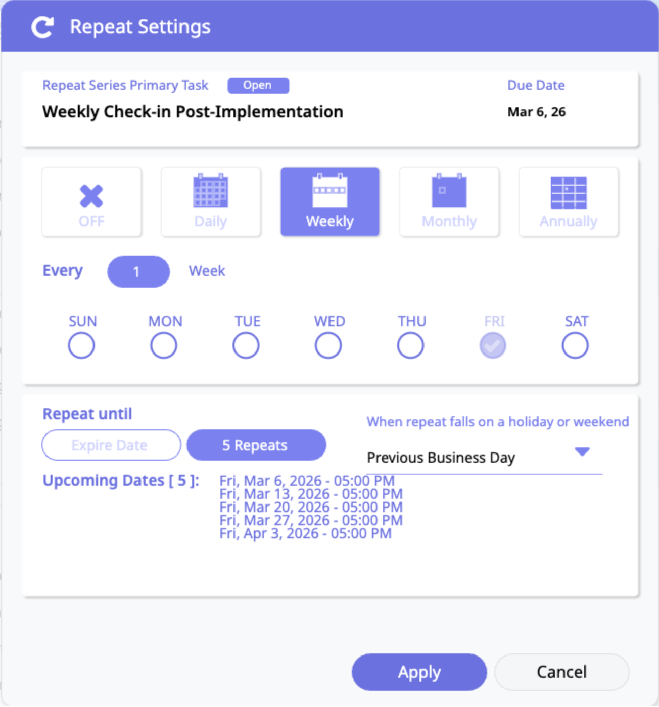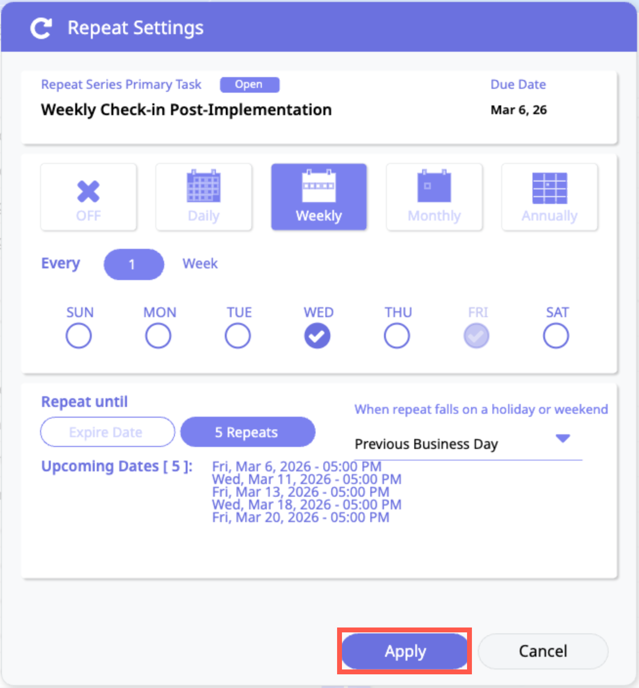 - The Repeat Settings Dialogue will open. Make any desired changes and click Apply to save.