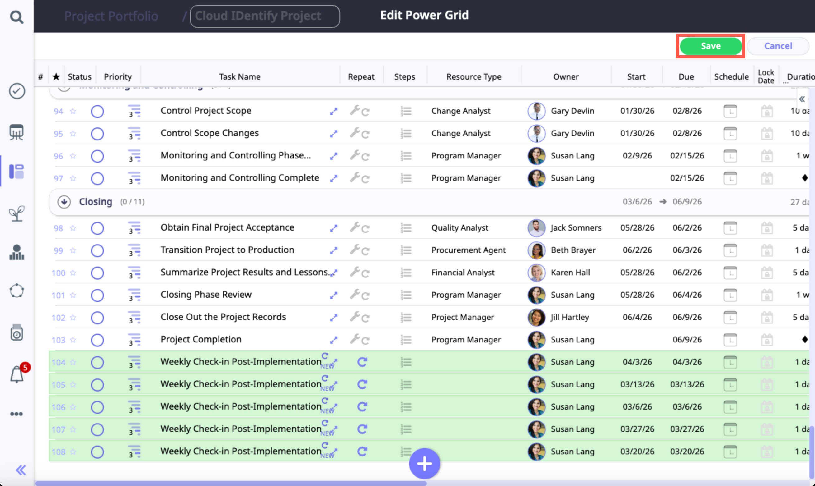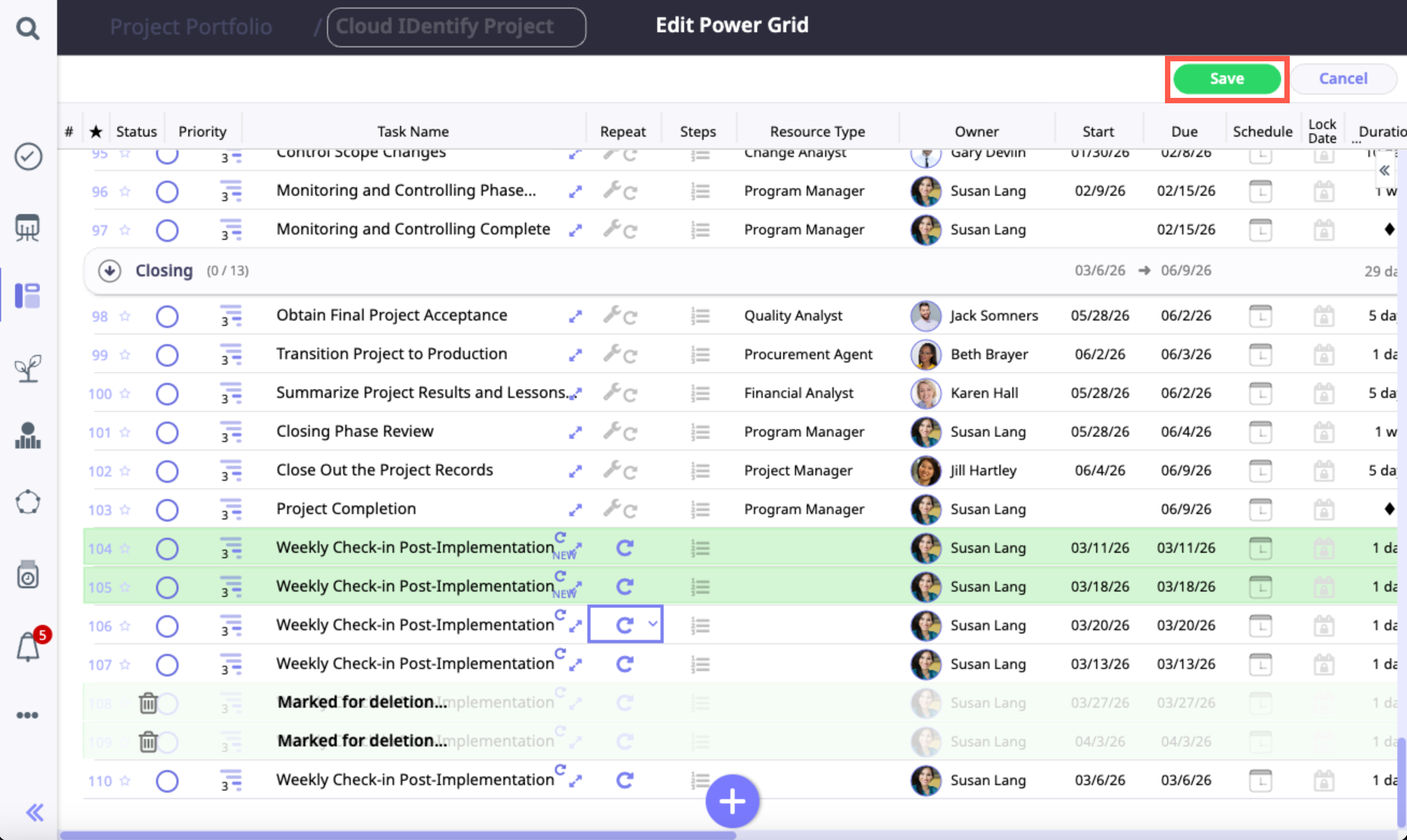 - The Edit PowerGrid screen will open, displaying all of the repeating tasks in green. Click Save to keep these repeat tasks.
