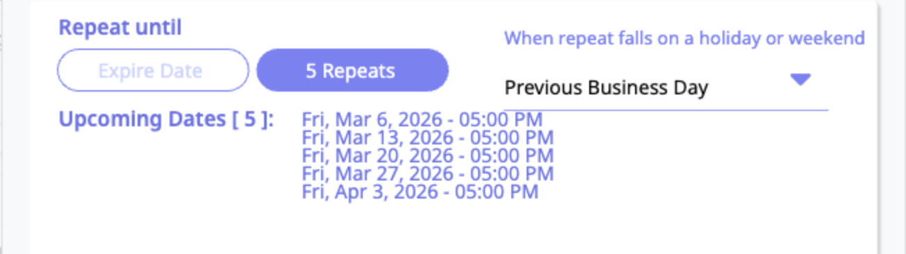 a. Until an Expiration Date: Enter a date here and the task will repeat with the frequency you applied above, until the expiration date is reached. The upcoming dates of repeat instances will be listed below. b. A Set Number of Times: Choose the number of times the task will repeat. The upcoming dates of repeat instances will be listed below.