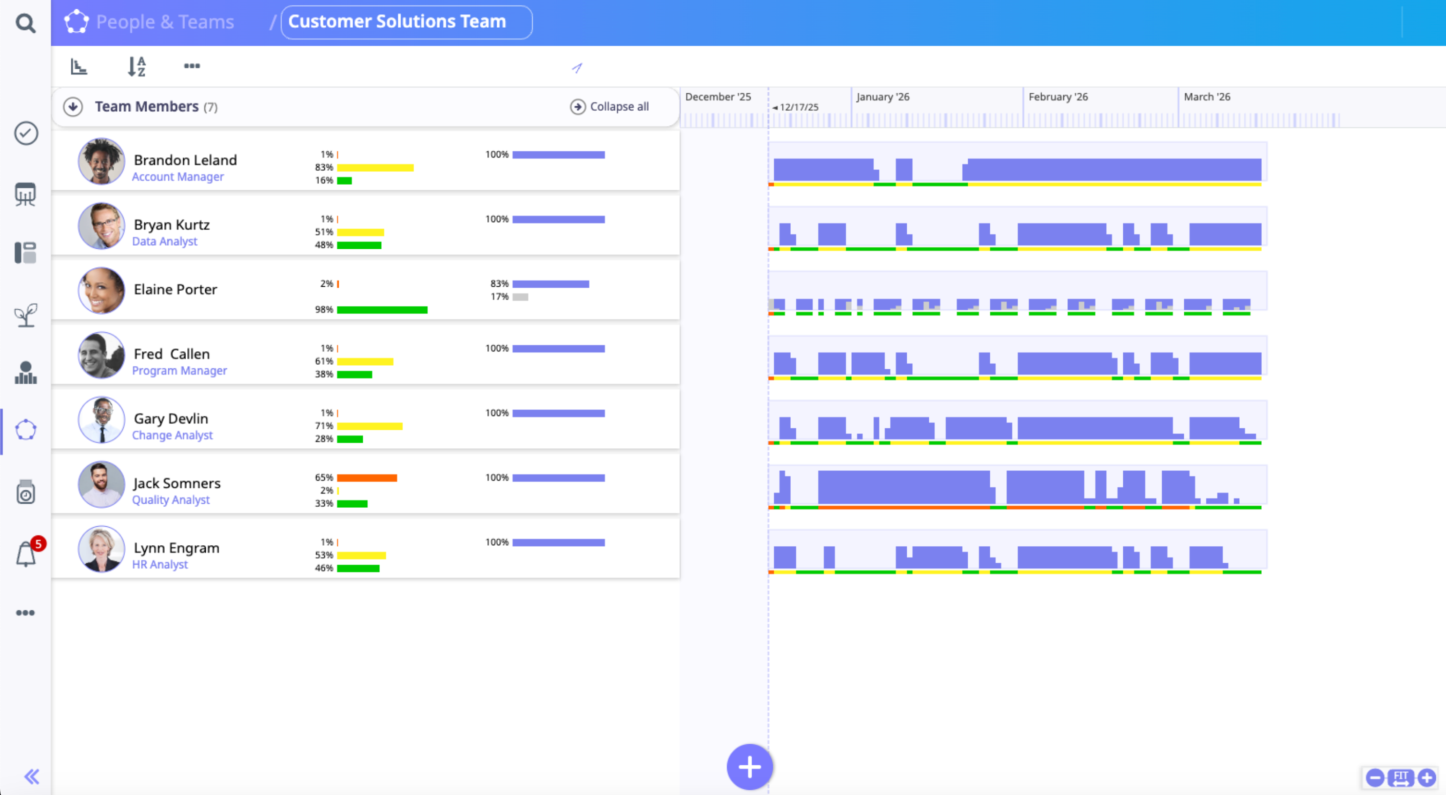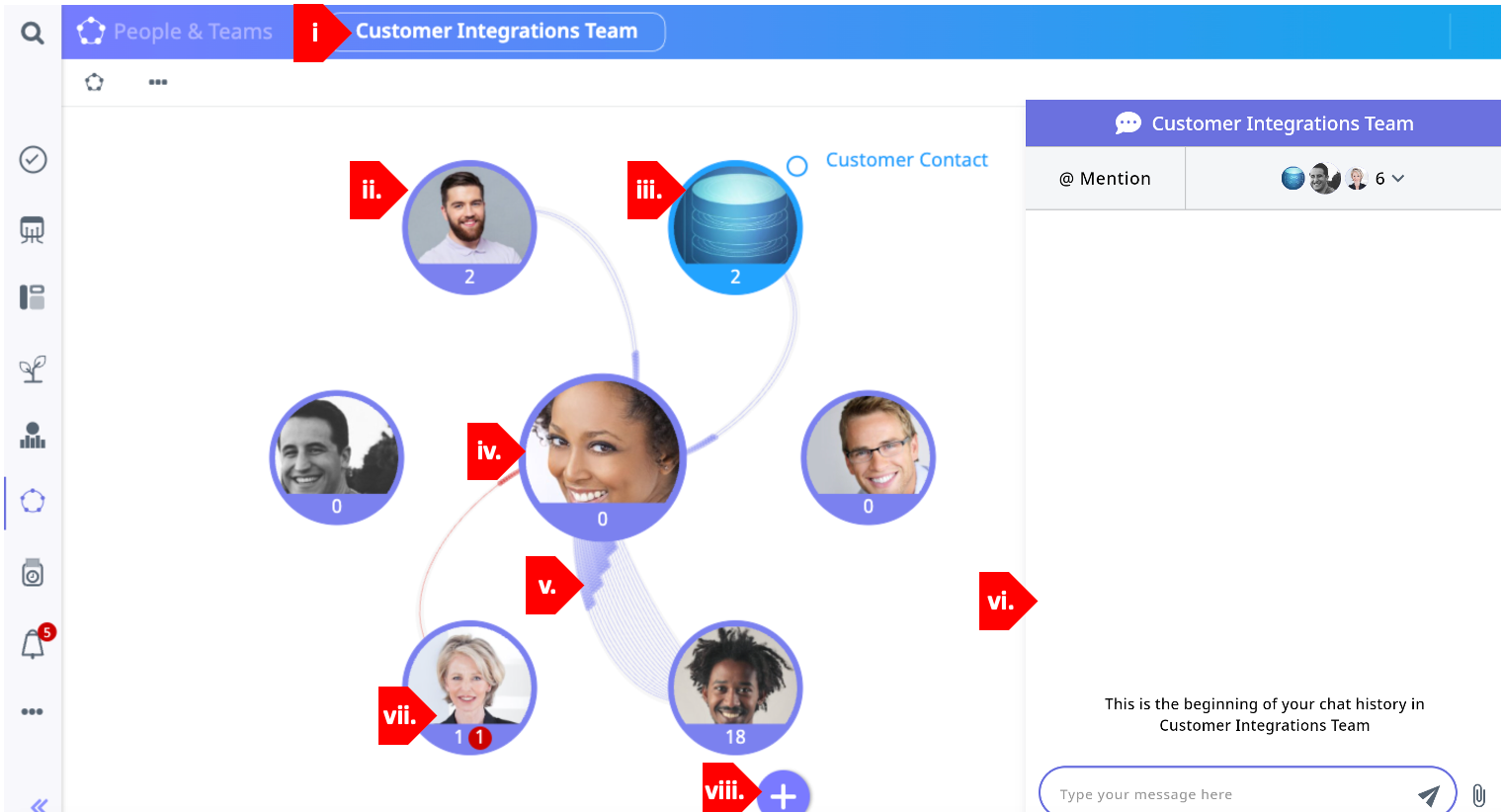 a. Circle View: This information is particularly useful for managers to quickly understand their team dynamics. From viewing this animated visual, they can learn who is communicating with whom, who is managing their tasks well, and who might need a friendly reminder to complete an assigned task. i. Team Name + Edit: The team whose detail you are viewing is displayed here. Click this button and the Edit Team window will open, allowing you to change the team name, add or remove members or mark the team as “inactive.” ii. Team Member: All standard team members are represented in the surrounding circle of purple avatars. The number of tasks that they have been assigned appears beneath their photo. iii. Extended Team Member: Team members whose circle is outlined in blue are extended team members, meaning that they have joined from outside of your organization. iv. Primary Leader: The team member found at the center of the circle is the team's Primary Leader. v. Collaboration: The electron flow between team members reflects the amount of communication (emails, task assignments, kudos, etc.) happening within the group. The more electrons, the more activity is occurring between members. Activity in red indicates that tasks are behind, or that a teammate has been “nudged.” vi. Messaging: Use this instant messaging tool to communicate in real-time with teammates. Message team members (including extended users) using this tool, and a record of all communications will be maintained until manually deleted. To mention another user in a message, click the @ icon. A notification will be sent alerting that user that they have been mentioned in this communication. vii. Late Task: The red number shown below this team member's avatar indicates that she has one late task. viii. Master Add Button: Use this button to add new members to your team. It can also be used to add projects, teams, or tasks. NOTE: Extended Teammates: Photos with a bright blue circle and the icon represent an Extended User. These individuals are external to your organization but have been invited to collaborate within Office. They can view whichever SmartTasks and communications you choose (when you set their security rights). b. Hierarchy View: This view is a simple way to see everyone’s role within the team hierarchy and how everyone is tracking on their tasks. i. Team Name + Edit: The team whose detail you are viewing is displayed here. Click this button and the Edit Team window will open, allowing you to change the team name, add or remove members or mark the team as “inactive.” ii. The Primary Leader: The person at the top in this view (with the purple star) is the Primary Leader of the team. Leaders are denoted by a white star in the same location. Regular members are displayed without a star. iii. Number of Tasks Assigned: The white number found below each team member's photo indicates how many tasks they have been assigned. iv. Number of Delayed Tasks: The red number in each person’s circle represents the number of tasks whose deadline has passed. v. Messaging: Use this instant messaging tool to communicate in real-time with teammates. Message team members (including extended users) using this tool, and a record of all communications will be maintained until manually deleted. To mention another user in a message, click the @ icon. A notification will be sent alerting that user that they have been mentioned in this communication. c. Timeline View: i. Teammates: Each member of your team is listed in this view in alphabetical order. Clicking on a team member’s name will bring you to their Task view. ii. Capacity Averages: The center column displays the percentage of the next 90 days that are over capacity (red), slightly under capacity (orange), under capacity (yellow) and available (green). These percentages consider the Capacity and Calendar settings that each user has configured, which detail how much time they are available to work. They also consider tasks assigned to the user and meetings on their calendar (via the calendar integration). Learn more about the Capacity and Calendar settings here. iii. Work vs. Meetings Breakdown: This third column shows the percentage of time over the next 90 days allocated to tasks (purple) vs. the percentage of time allocated to meetings (grey). iv. Capacity Forecast: This visualization shows how your team’s capacity fluctuates in the coming weeks. Each work day is represented with graphs that display the breakdown of work vs. meetings and the overall capacity of that team member for that day. v. Zoom: Adjust the view settings on the Capacity Forecast, zooming in or out, or clicking Fit to return to the default zoom.