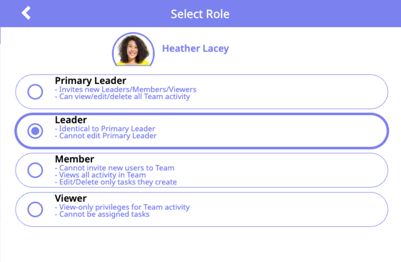 Select the role for this member by choosing one of the following:i. Primary Leader – This user has complete control to invite new members and edit and delete team activity. (Note that only one member can hold this role at a time.) ii. Leader – This user has the same rights and roles as the Primary Leader except they cannot edit the Primary Leader. iii. Member – This user can view all team activity but can only edit and delete their own tasks, not those created by others. iv. Viewer – This user can view activity but cannot create or be assigned tasks. e. Once the role type has been selected, you will return to the Edit Team screen where the team member’s new role appears.