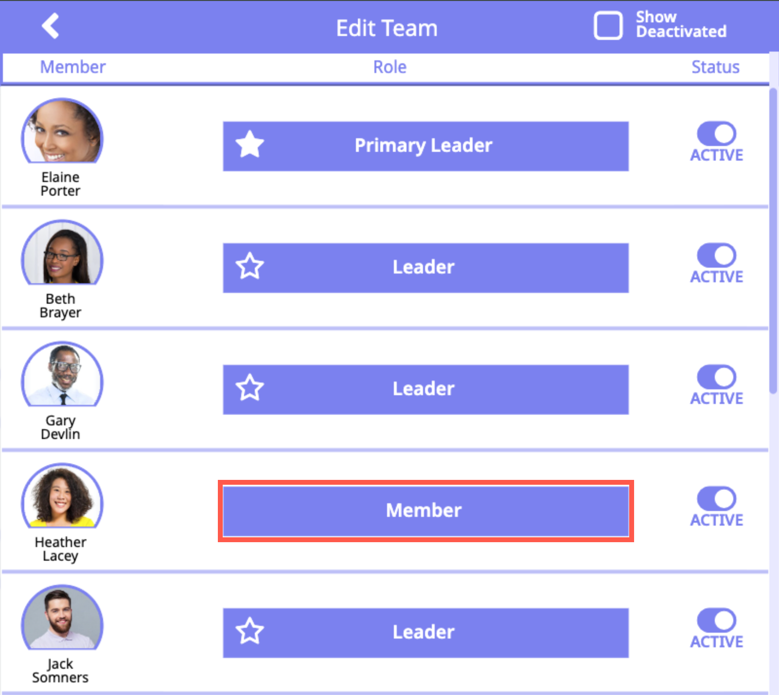 If a team member takes leave or needs to be removed temporarily from a team, they can be deactivated.a. Click the Active slider beside the desired user to toggle to Deactivated.