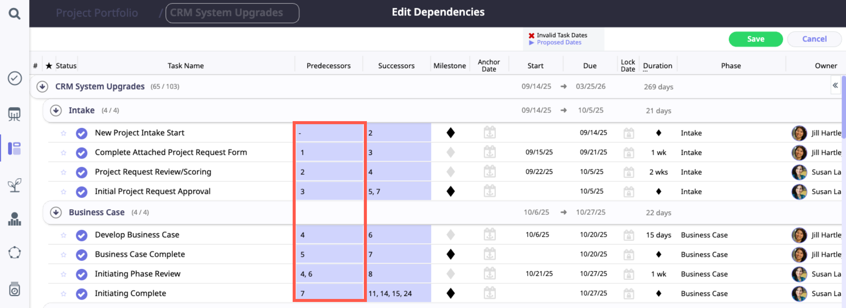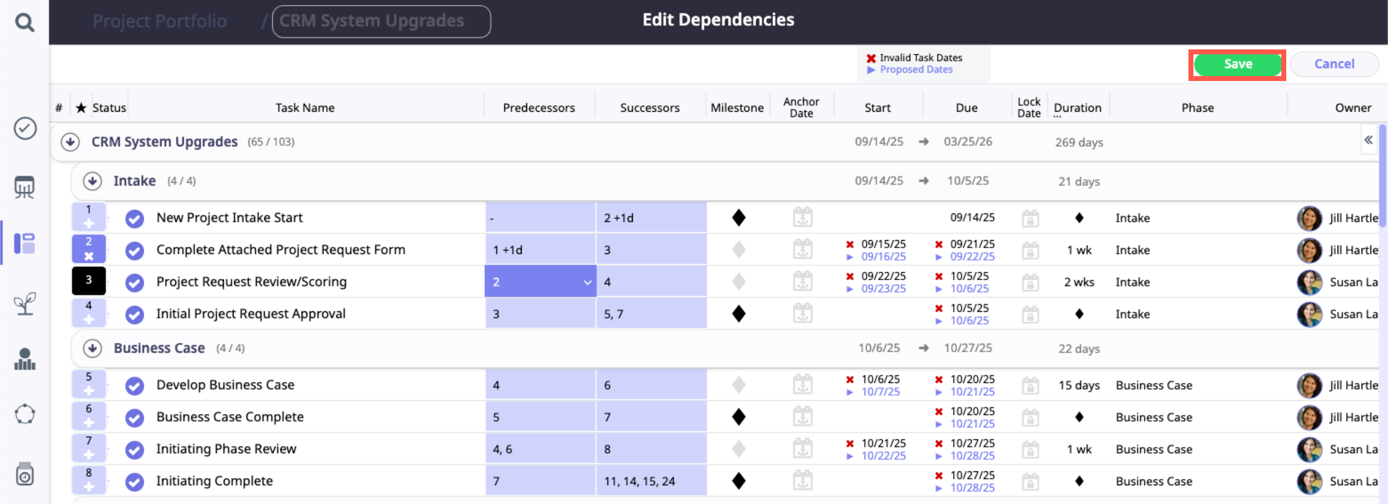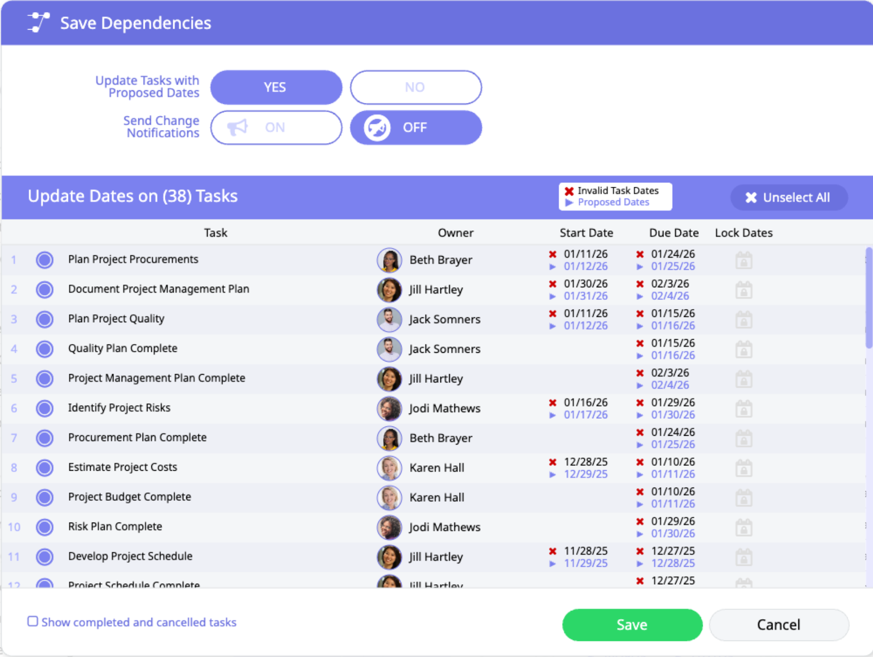 If changes have been made to dependencies, you will be prompted to update dates on tasks impacted by the changes.