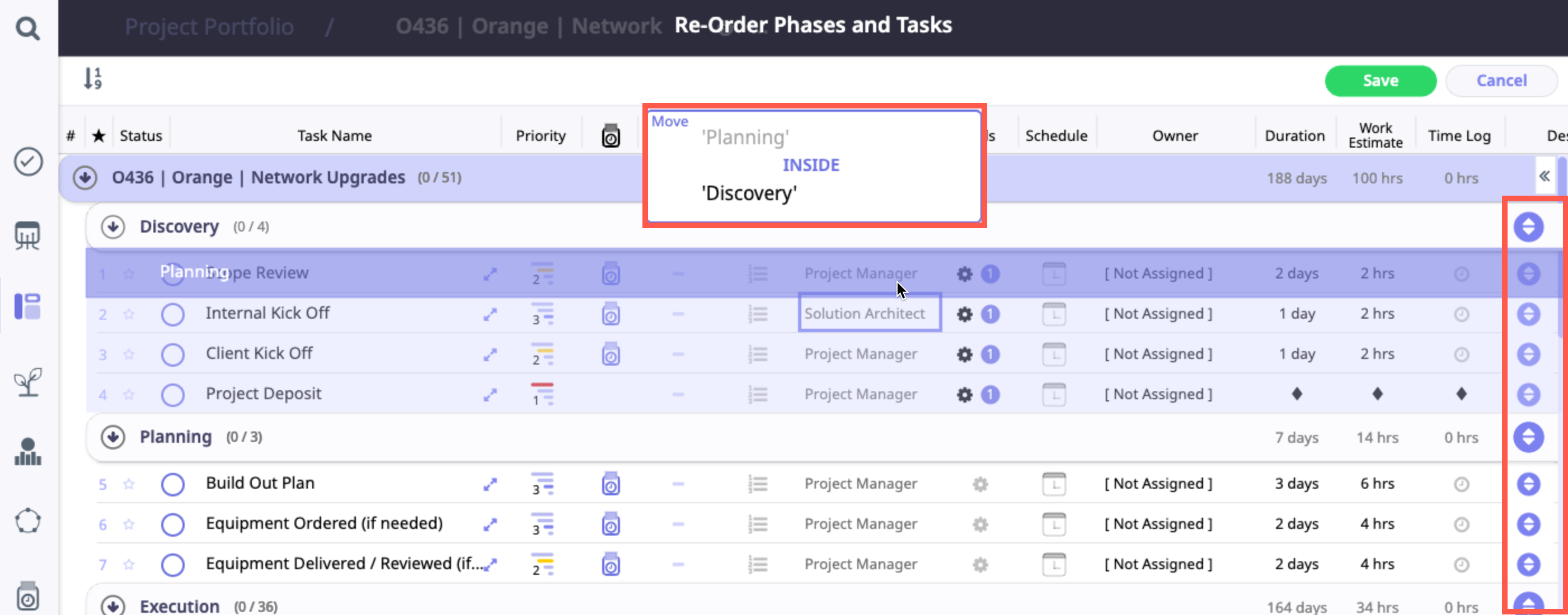 d. Do not release the “click” until the phase has been dragged into the proper location, then release to drop it. Once it is in place, click Save to keep your changes.