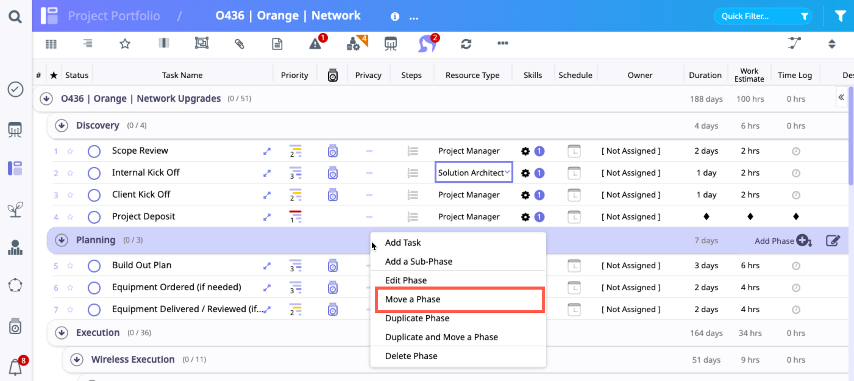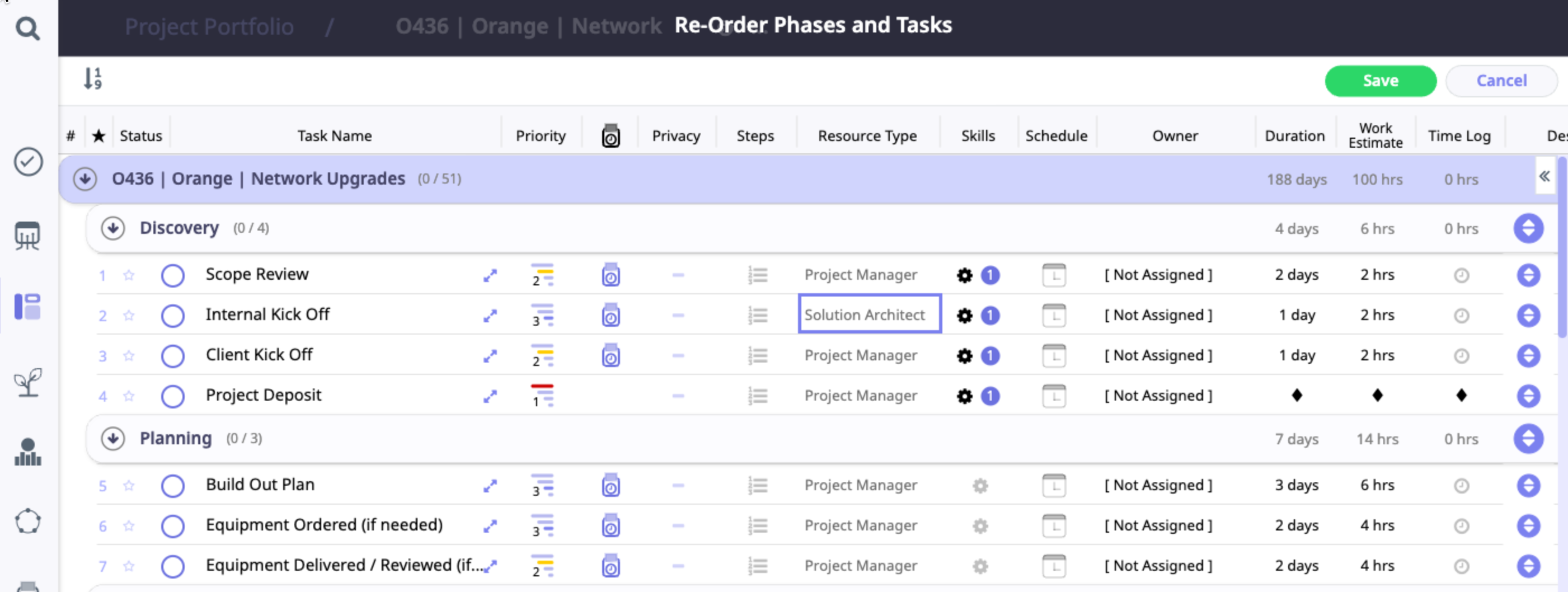 b. The project shifts into Re-Order Phases and Tasks mode.