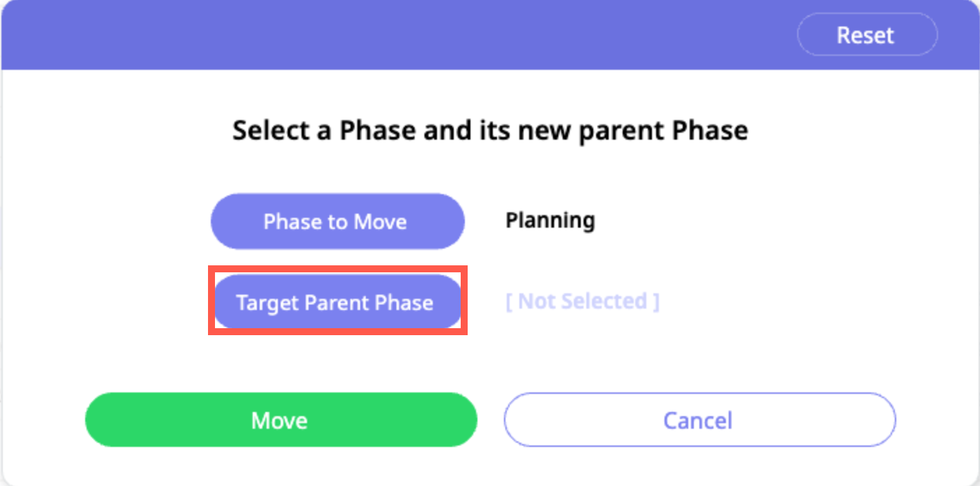 b. The dialogue to move a phase opens, displaying the phase that you wish to move. Click on the Target Parent Phase button to select the destination for this phase.
