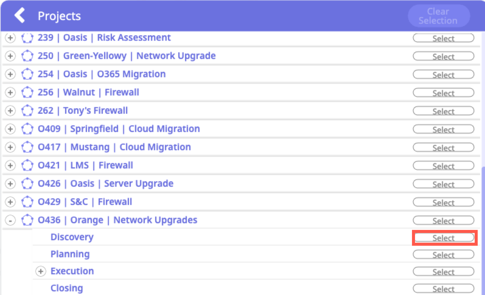 c. A listing of project opens. First find the project you wish to move the phase to (it may be the same project you are in now). Click the expand button to the left of the project's name to view phases and sub-phases of the projects. Then click the Select button that corresponds to the project and phase into which the original phase will be moved.