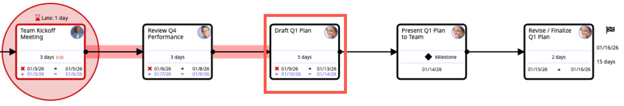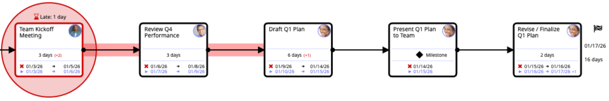 In the example below there is a one day delay on the Team Kickoff Meeting task in the Critical Path. The original dates are shown here in Critical Path view denoted by a red "x." The Team Kickoff Meeting should have been finished on 1/5, but was not. The forecasted dates are shown below the original dates in purple. Look at the last task in the Critical Path--Revise/Finalize Q1 Plan--notice that our original completion date of 1/16 has shifted out to 1/17. This is one business day behind schedule. Without remediation our original deadline will be missed.