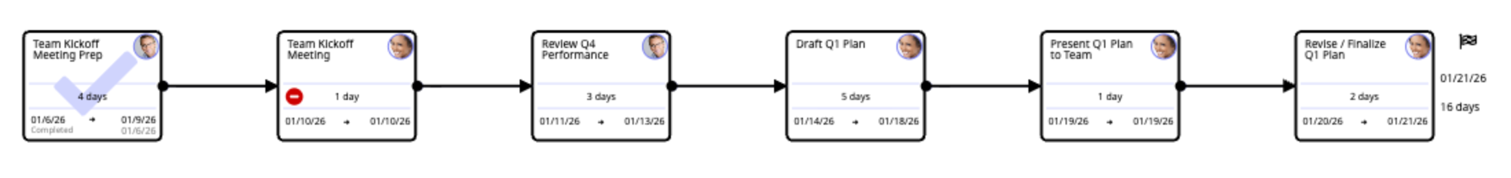 In the example below, a delay to the "Team Kickoff Meeting" task's deadline would impact the four downstream tasks awaiting its completion.