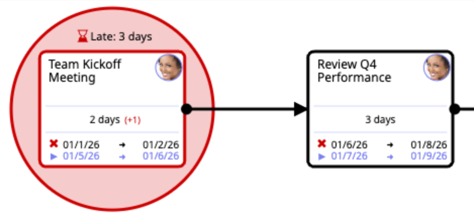 Why it matters: The project plan is not currently accurate, so the forecasted work and completion dates calculated by Moovila are not reliable. In the example below note the impact on the final task in the Critical Path caused by updating the duration of another task in the workstream. The original end date of 1/16 (shown next to the red "x") is no longer being reached, and the new forecasted date of 1/17 appears in purple.