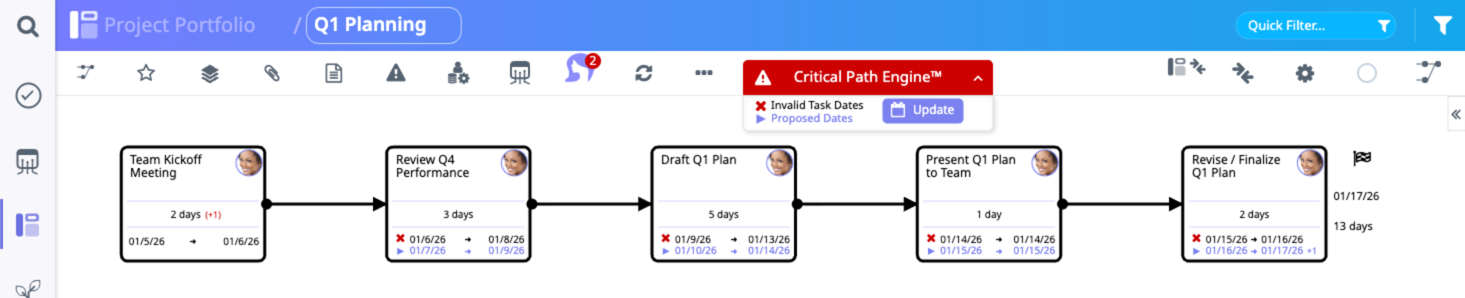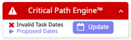 What it is: The Critical Path Engine has recognized updates to the project's timeline, but these dates have not been applied to the project plan. This could be updates based upon new tasks being added to the project and associated with other tasks via dependencies, due to delays in work, or changes in durations.