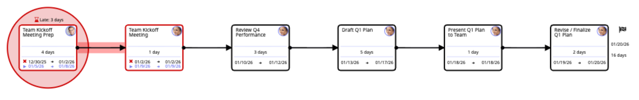 Why it matters: The delay of even a single task may have a ripple effect, impacting future task start dates, and ultimately, the completion date for the project. In the example below the first task in the Critical Path is three days late--note the red line that extends forward into the next task. This indicates the tasks that will be impacted as well by the delay.