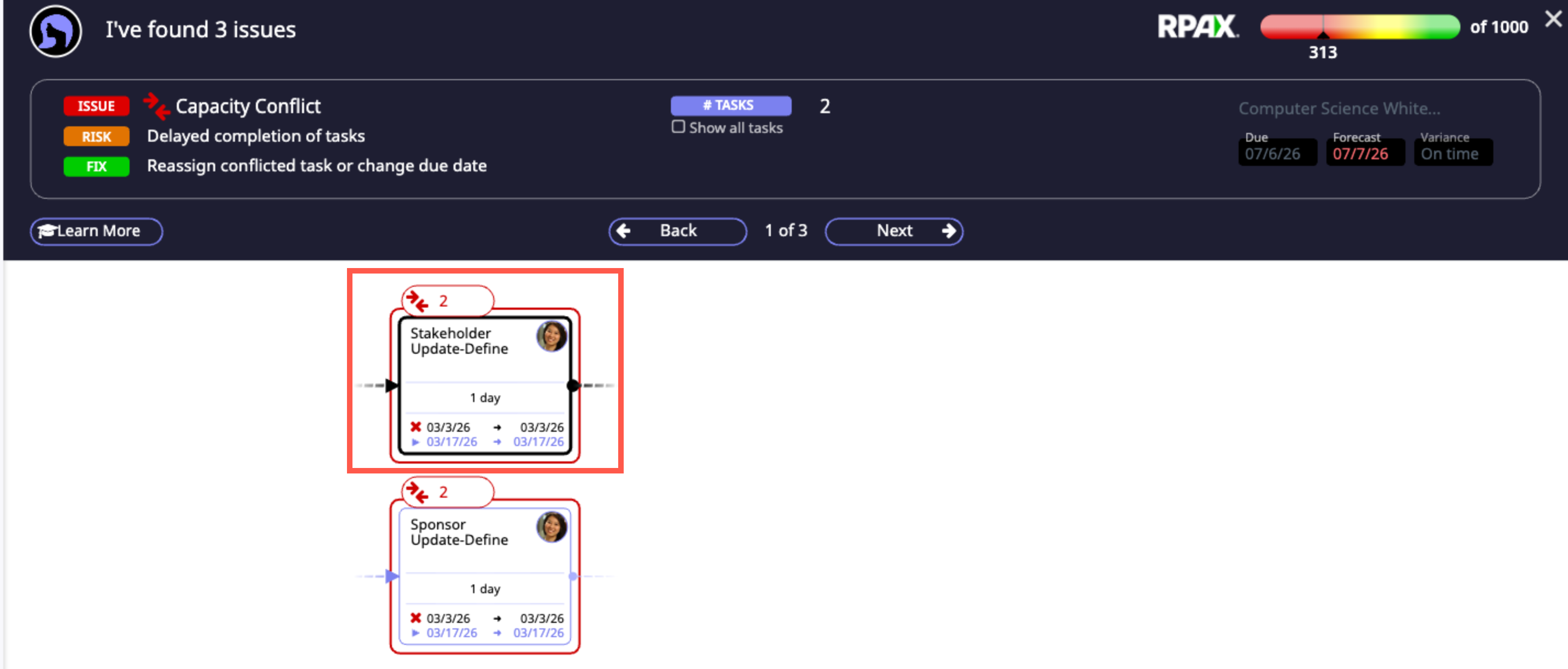 The Capacity Conflict Manager will display which specific tasks have contributed to this conflict. If the task owner is the only person on your team able to complete this task, you might negotiate with other projects to see if they could reassign their task to another resource, freeing up time for your task owner, or even look into other dates on which the task could be completed. Click on the assigned user to reassign the task.