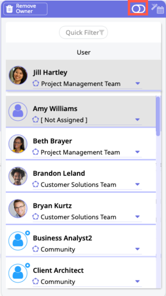 The User Selection dialogue opens. Choose a resource from this list or click the toggle at the top of this dialogue to open the Resource dialogue.