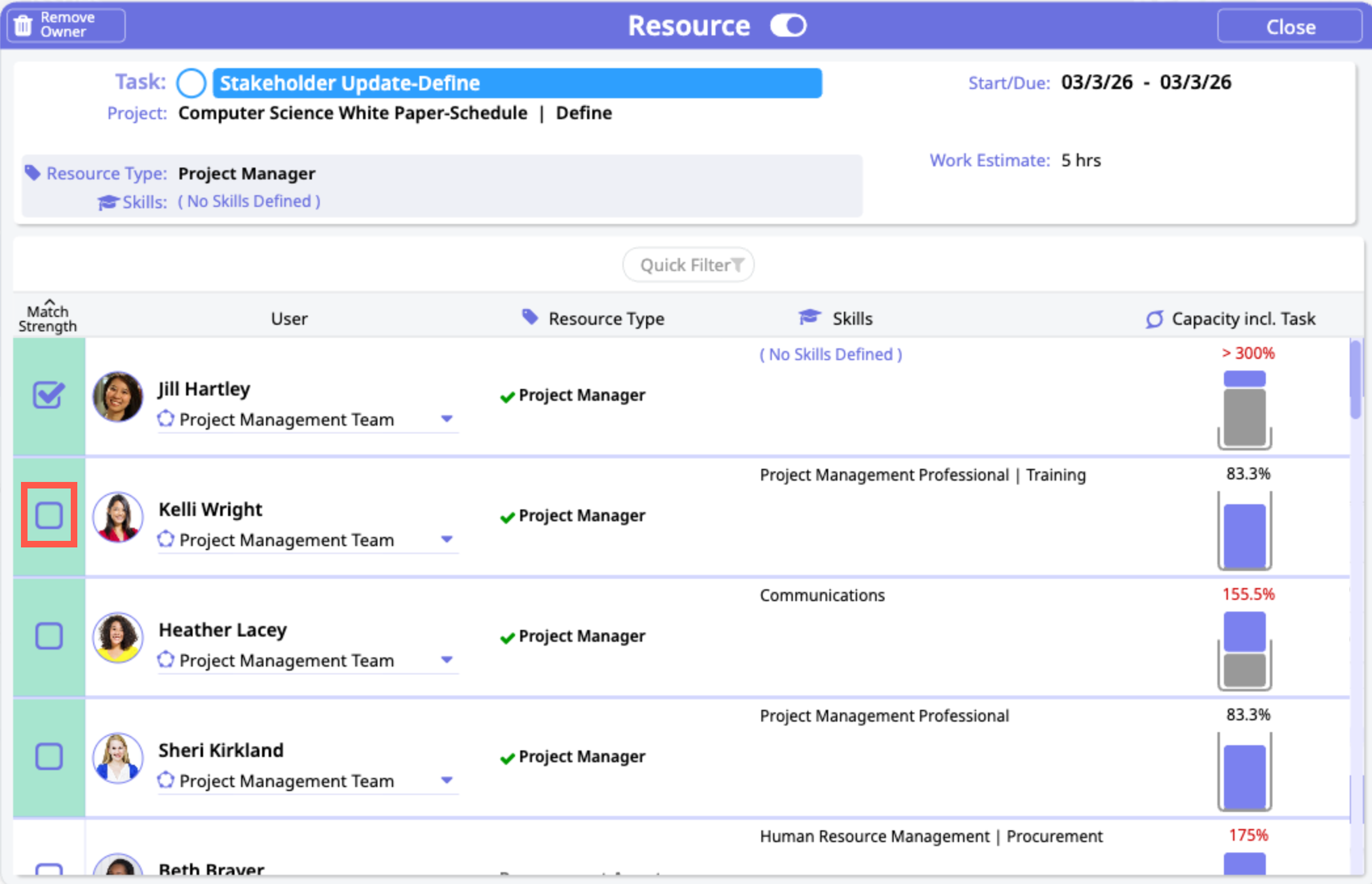 The Resource dialogue opens, displaying a listing of available resources, with the most appropriate resource listed first. These are sorted based upon the needed resource type, any skills associated with the task and the capacity of each resource. Check the box to select a new task owner.