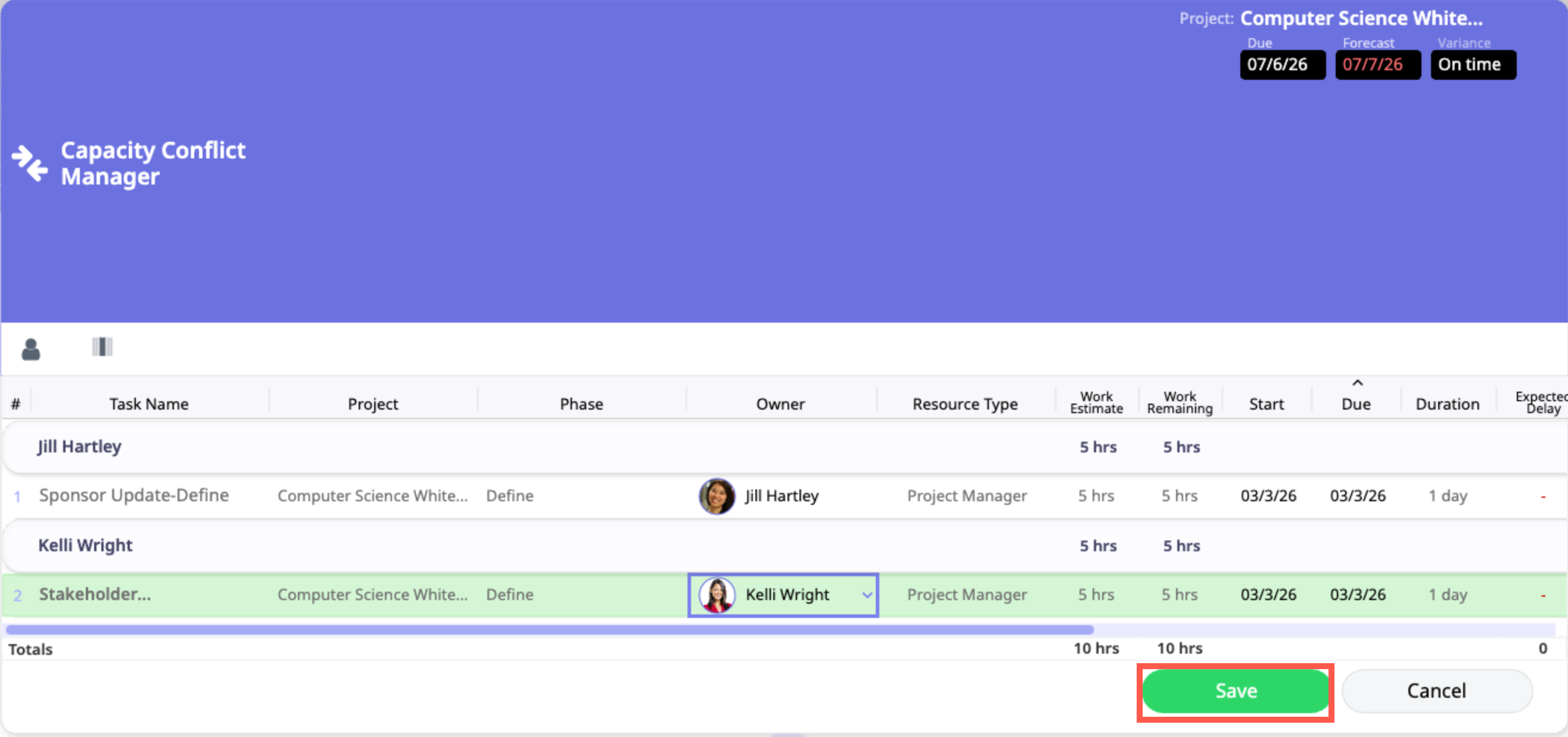 The new task owners appears alongside the task in the listing, alleviating the conflict. Click Save to finalize this reassignment.