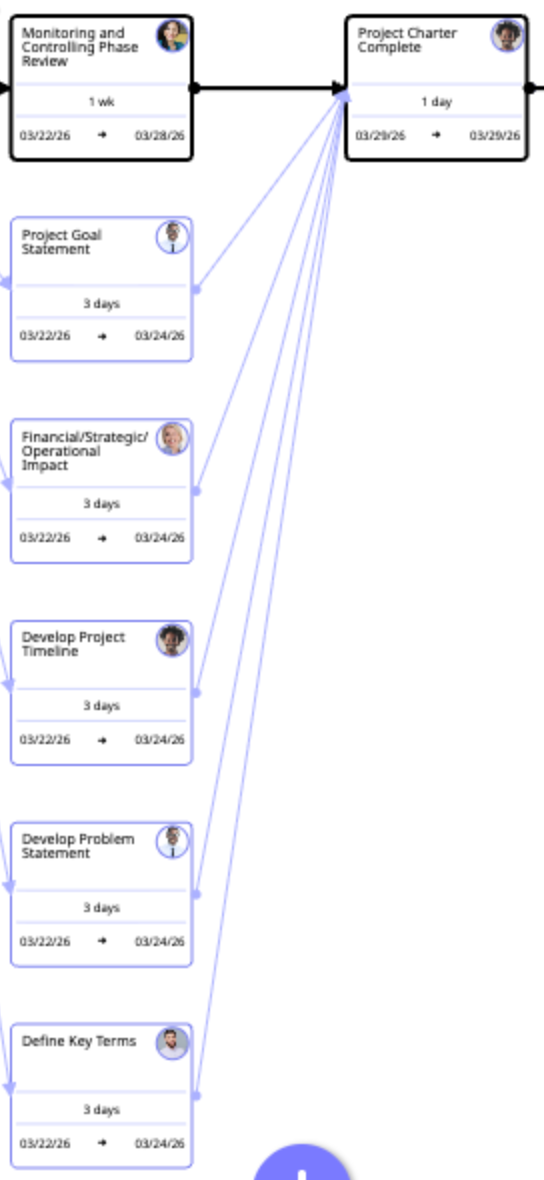 Why it matters: A delay of even one of the predecessor tasks can impact the task's start date. Depending on the completion of the many tasks increases the probability that the successor task will be delayed. For example, in the scenario above, if five of the six tasks that are needed to hit the Project Charter Complete milestone are complete but one is running a week behind, it is going to delay the Project Charter Complete milestone by a week.