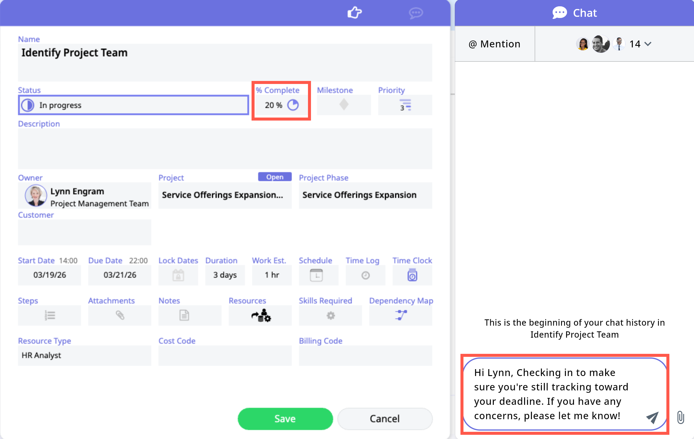 What's next: Consider breaking the bottleneck task into multiple tasks or milestones to mitigate this risk. If this is not possible, closely monitor status of all predecessor tasks to mitigate risk and ensure that the bottleneck task begins on time. This can be achieved by checking in regularly with task owners via chat or keeping a close eye on the tasks' percent complete updates.