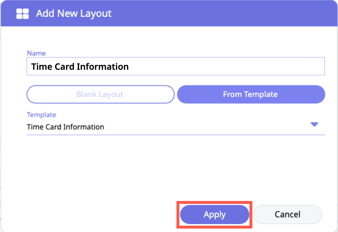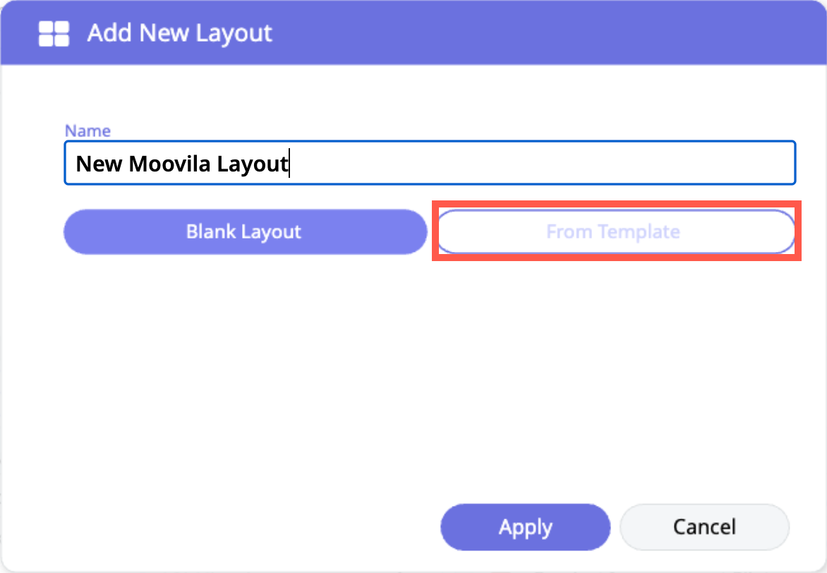 a. When the Add New Layout screen opens, choose the From Template option. Note that button will only appear when there are templates available. b. Choose the template you wish to use from the dropdown menu. The template's name will appear in the Name field, but this can be modified so that it displays differently. Click Apply to add the layout. c. The layout is added to the dashboard. It can either be saved as-is, or panels can be added or edited. - Once all panels have been added or edited, click the Save button to save the layout.