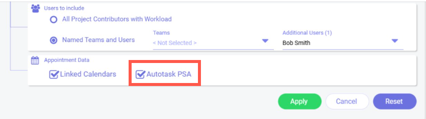 - This data can be pulled into Resource Capacity via Filters > Appointment Data > Autotask PSA.