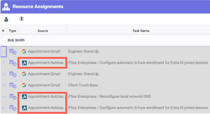 - A source tag in Resource Capacity will indicate which data has come from Autotask. It will also include the resource, times, and work associated.