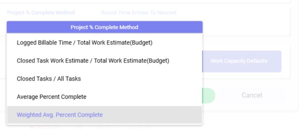 New Option for Project % Complete Method: The Weighted Percent Complete option was added to provide another possibility for the way that percent complete may be calculated. Instead of averaging task percentages equally, this method weights each task by its estimated effort (hours). The result is a more accurate view of overall progress in which large, high-effort tasks contribute proportionally more than small tasks. This can be selected at the project level and set as an enterprise default value for new projects.