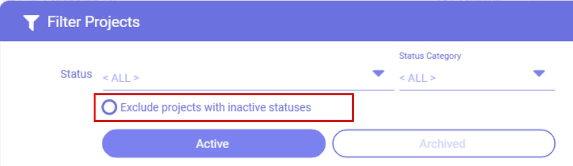 - A new filter in Portfolio view excludes inactive statuses. This removes projects that are associated with inactive statuses. This filter option is only available to those who also have custom status filtering available.