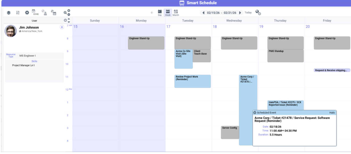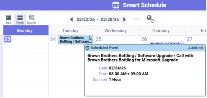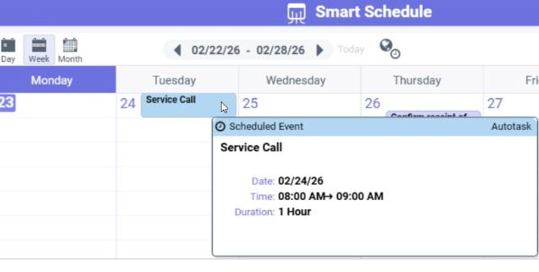 - Data from all Top-Level Appointments, Tasks, Holidays, as well as Project and Service Ticket Appointments are now pulled in to provide a single integrated view within Smart Schedule.