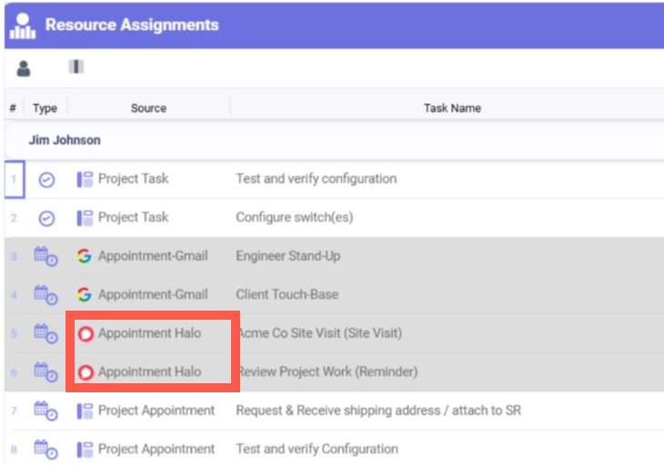 - A source tag in Resource Capacity will indicate which data has come from Halo. It will also include the resource, times, and work associated.