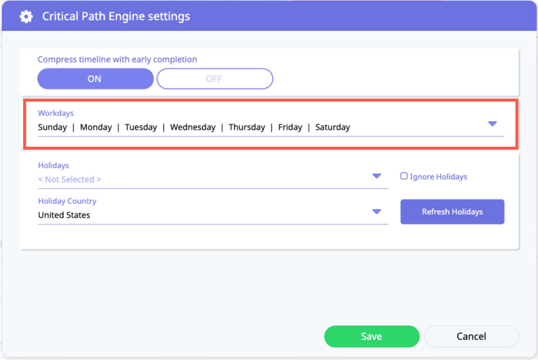 If the project is occurring in another country, you may click the Holiday Country menu to choose another option from the listing.