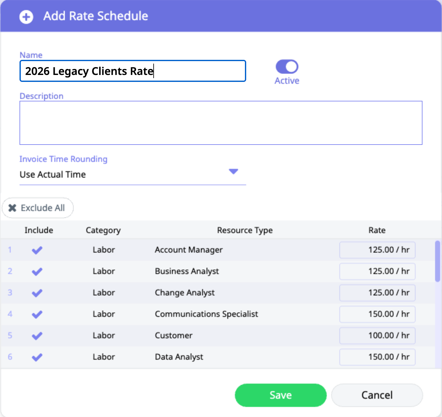 - Once the desired resource types and their corresponding labor rates have been set up, click the Save button to move forward with this rate schedule, or the Cancel button to discard.