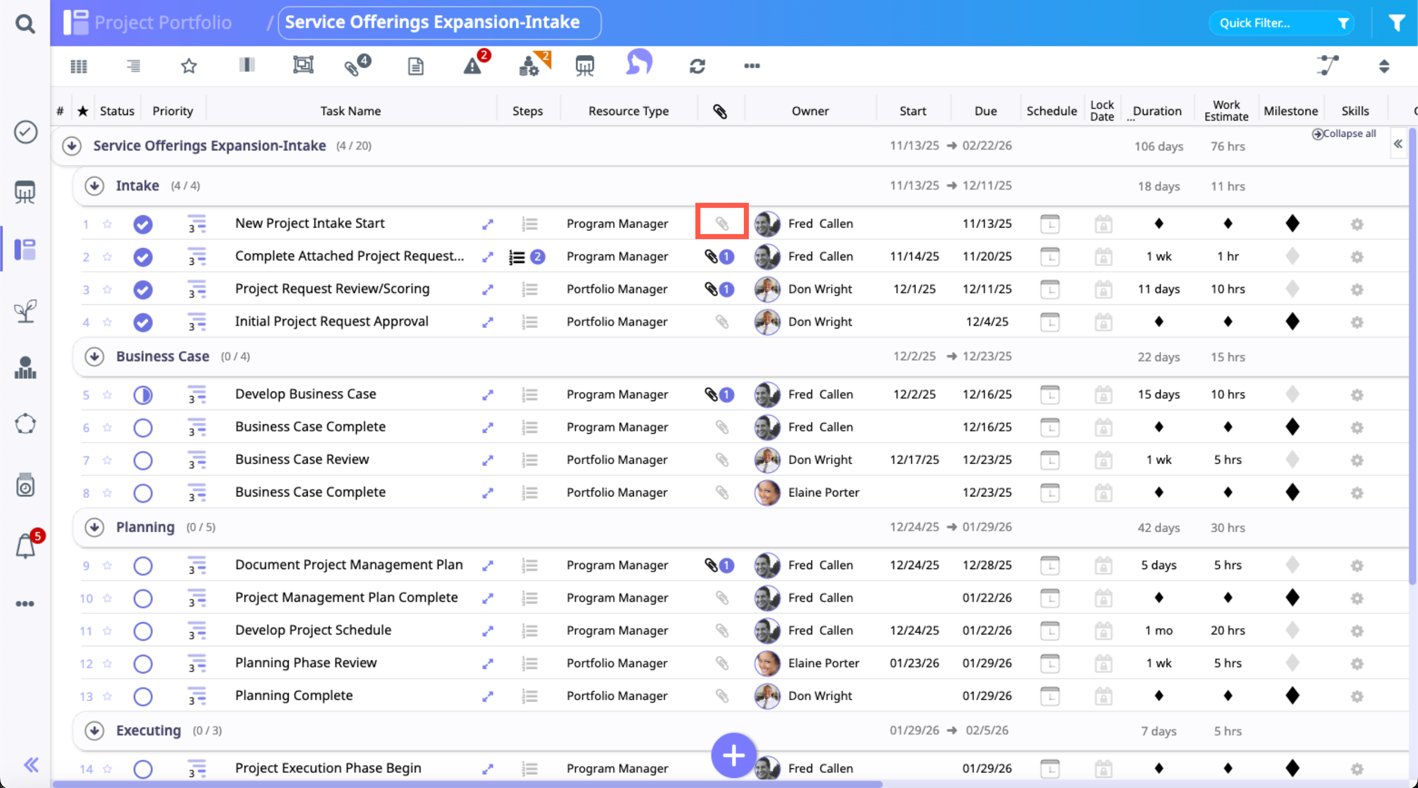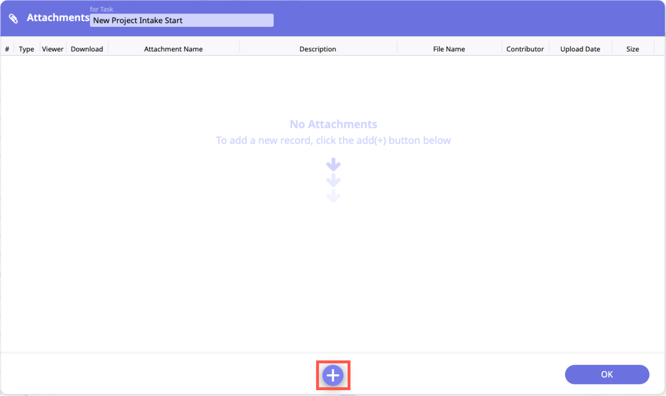 - Open the project, and click on the Attachment icon in the row of the task that will hold the attachment. (If the attachment icon does not appear, you may need to add it by clicking on the Column icon