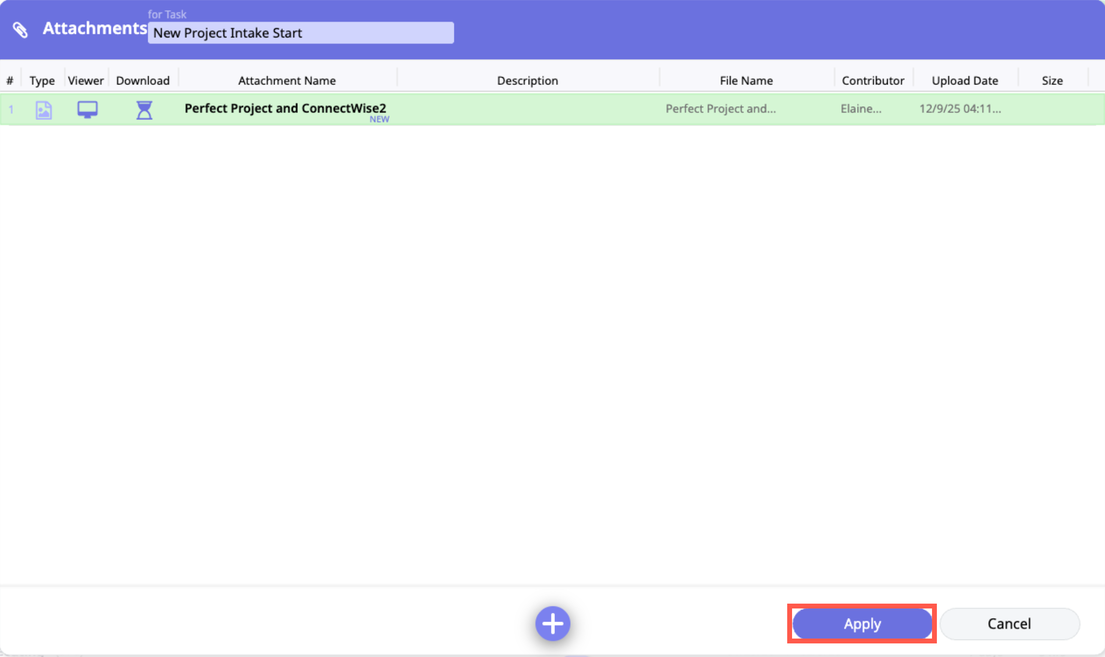 - The location opens, and a file can be selected. The File appears in your attachments listing with pre-filled details about the file type, whether it an be seen as a preview, the file name, contributor, and upload date. The Name and Description fields are editable. To add another file, click the Add button again. To save, click the Apply button, or click Cancel to discard.
