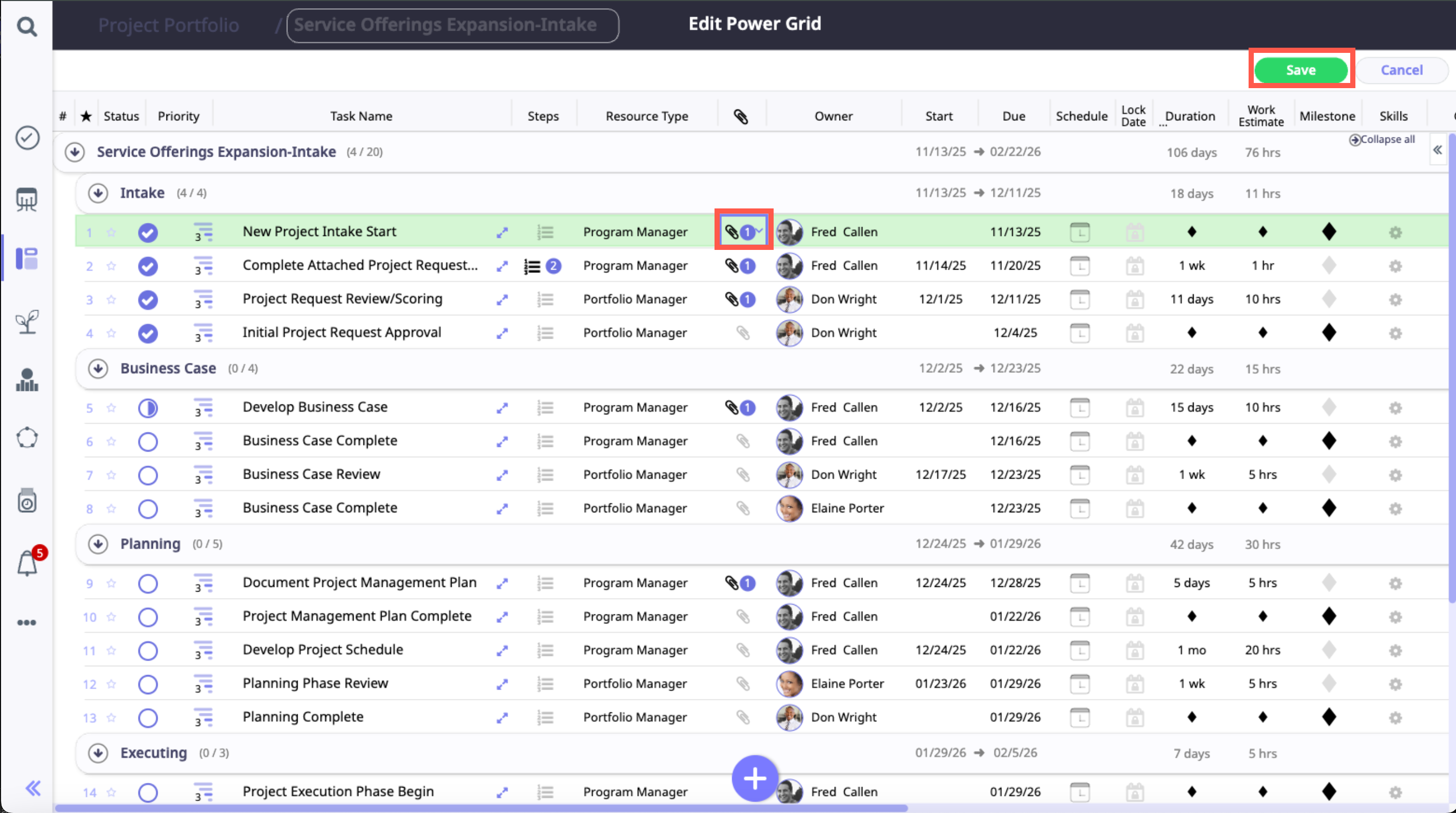 - The attachment now displays as a part of the count associated with this task. Click the Save button to save this attachment addition, or Cancel to discard.