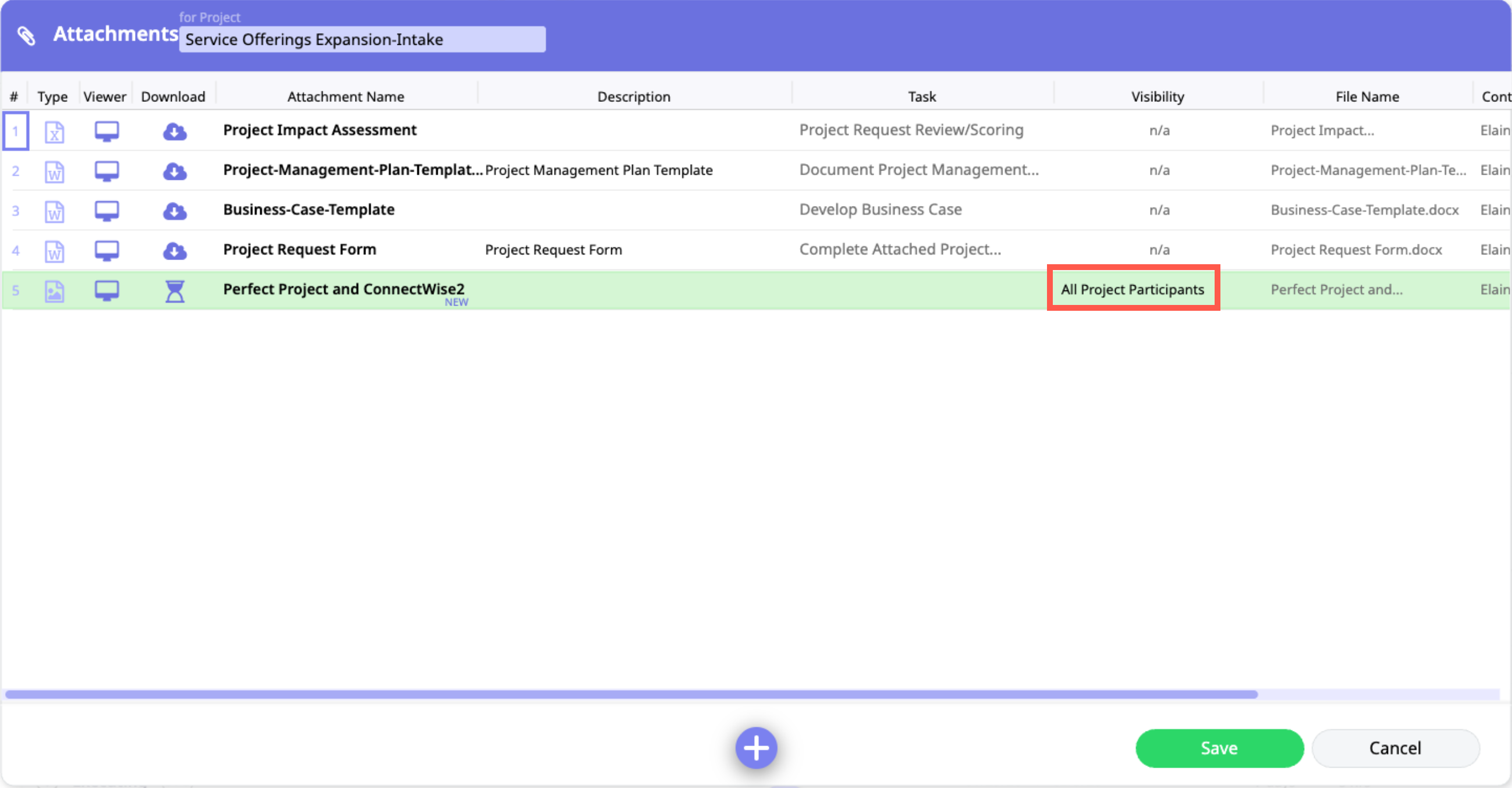 - The new file will appear in the listing. Note that the Task field for this attachment is empty. This will only be populated when the attachment is added at the task level. The attachment's name or description may be edited. By default, the visibility of an attachment is set to All Project Participants. This means that anyone with access to the project will have access to this file. To modify this setting, click on the Visibility field.