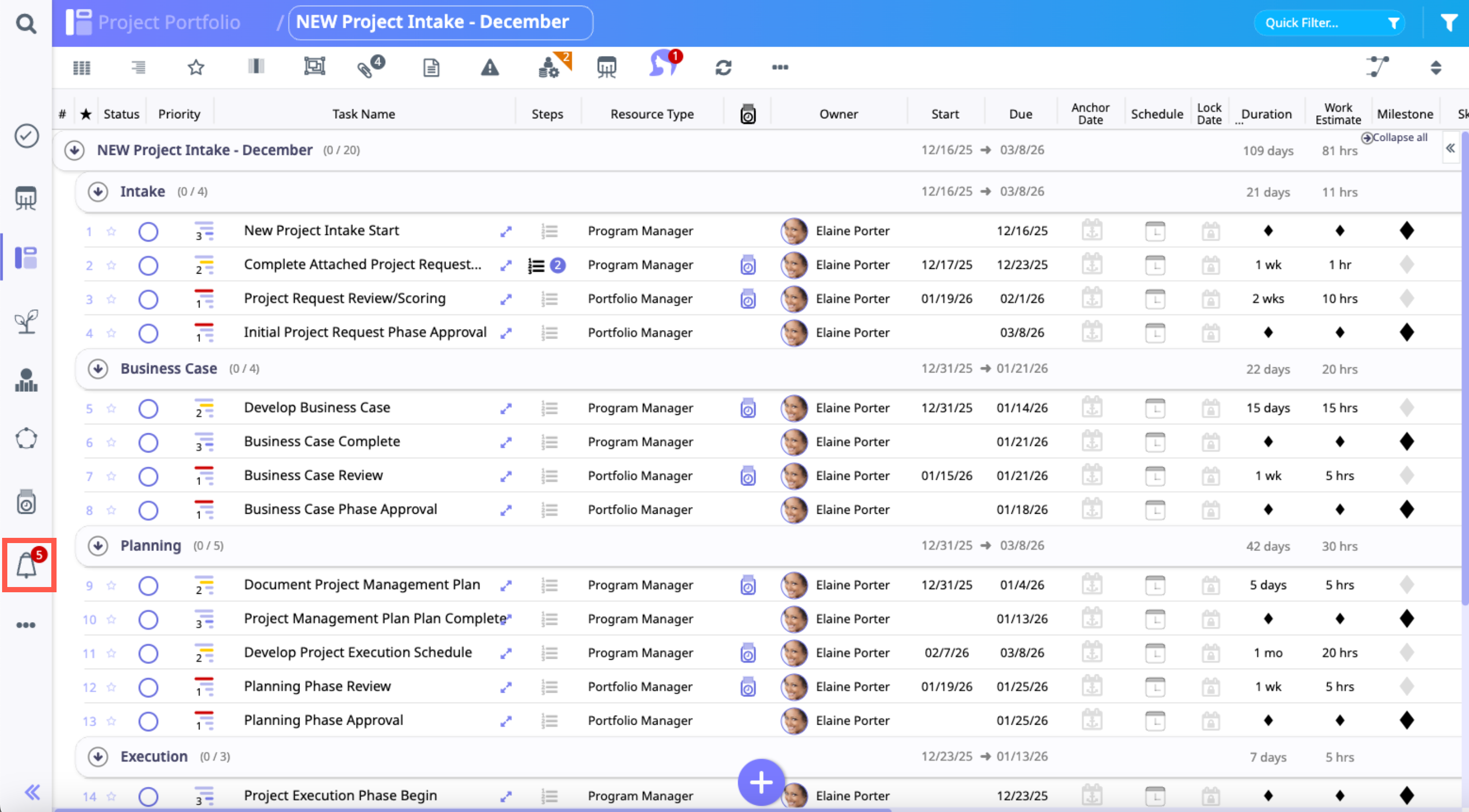 Please note, if you are expecting a notification for a task, but it has not yet appeared, the project status needs to be updated to In-Progress. Moovila suppresses task assignment notifications while the project status is Planning, On Hold, Cancelled, or Complete, so those task dates can be set and resourced before any assignment notifications go out.