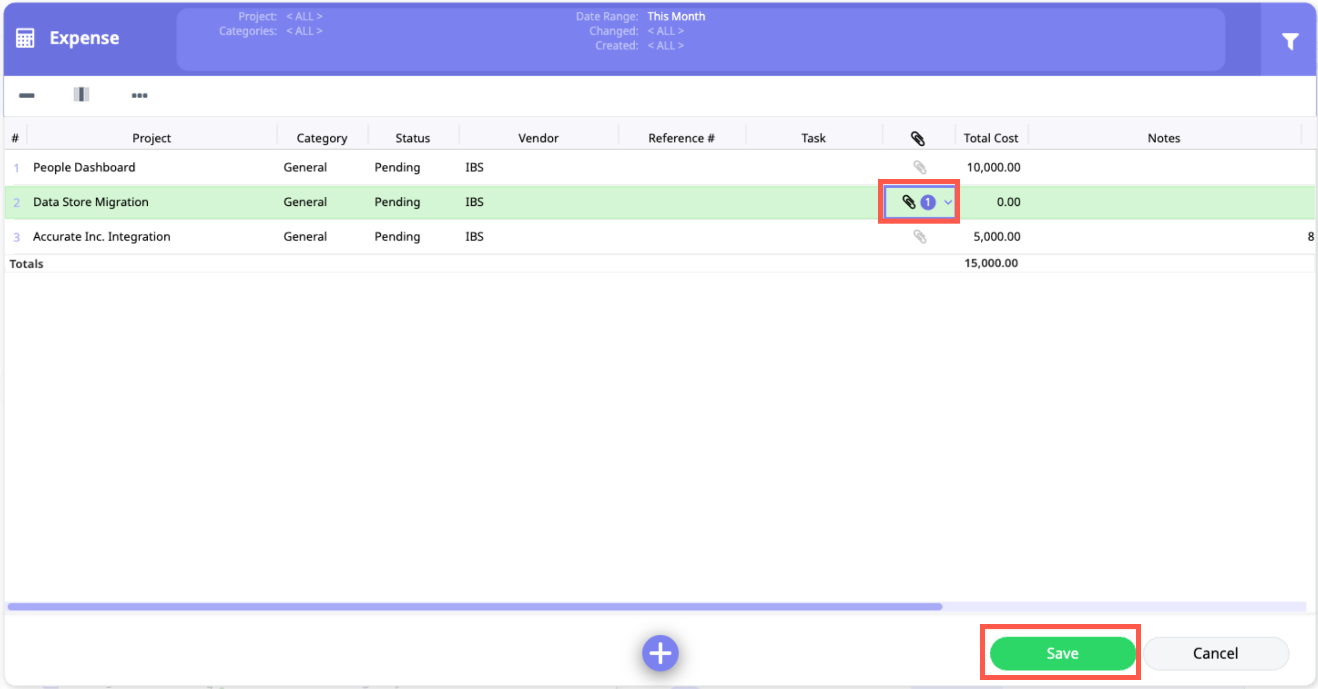 - Enter additional information for this expense via the Power Grid form, adding the expense status, vendor (adding a new vendor if needed), reference number, project, task, total cost, etc. Click on the Attachment icon in the Attachment column to add images documenting this expense.