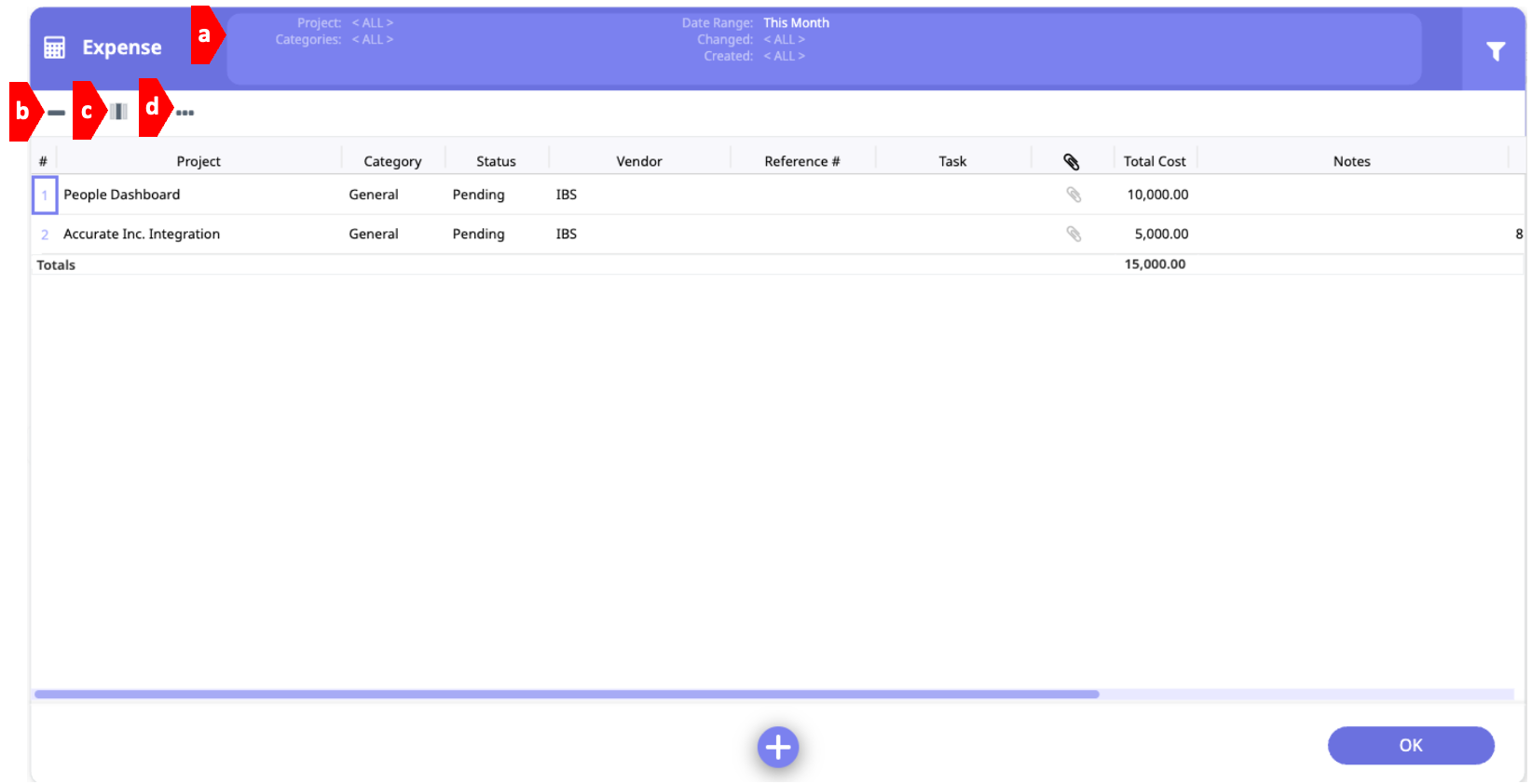 a. Filter Panel: Use this panel to limit the view of expenses to specific projects, a date range (by default it will show only this month's expenses), the date an expense was changed, or the date an expense was created. b. Group: Use this dropdown menu for the ability to group expenses by project, task, vendor, or category. c. Column Headers: Use this dropdown menu to include or remove columns from the General Expense Log view. d. More Options: This menu contains options to reset the columns to the original default set/width, export the General Expense Log as an .xls file, or print to a PDF file.